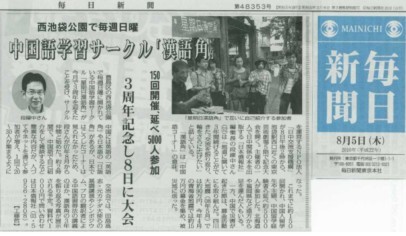 中新網8月11日電 日本僑報社創辦的星期日漢語角于8月8日在東京迎來了三周年紀念大會。此前的8月5日,1872年創刊、日本歷史最悠久的報紙《每日新聞》圖文并茂地報道了漢語角。漢語角創辦三年來,受到日本主流社會越來越多的關注。