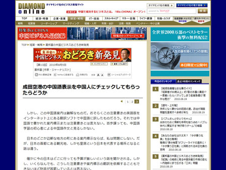 中新網8月20日電 據日本新華僑報網報道,今年7月1日,日本開始在此降低中國個人游入境門檻。顯然,日本民主黨執政上臺后把“觀光立國”作為一個基本國策。但是,要迎接大量中國游客的到來,日本真的準備好了嗎?近日,著名旅日華人作家莫邦富在日本主要經濟周刊《鉆石》網站上連續撰文,指出日本的“國門”成田機場里,面向中國游客的一些中文標識的翻譯十分粗糙,有些服務細節不如中國,工作人員在意識上還沒有完全做好接待中國游客的準備。