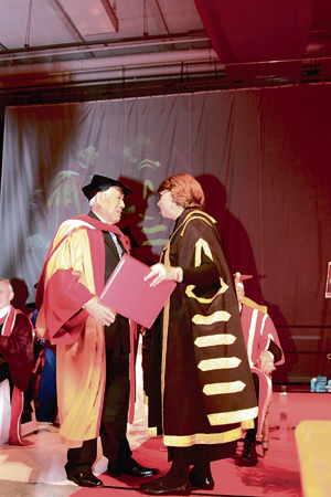 李耀明(左)從卡加利大學校監Joanne Cuthertbson手上,接過榮譽法學博士學位。(加拿大《星島日報》∕郭康立攝)