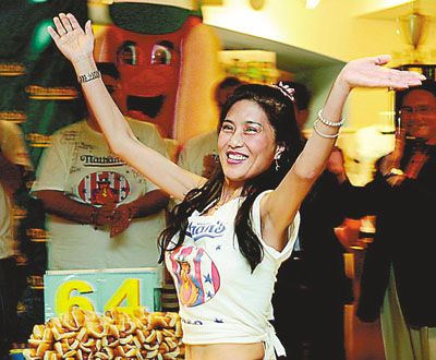 看過李蕙比賽的人都難以理解:她五尺出頭、腰細(xì)得只能穿零號牛仔褲的小女子,怎么能和那些五大三粗的猛男們競爭大胃王的寶座?不論是連續(xù)兩年在紐約著名的國慶節(jié)吃熱狗大賽中,還是在各地的競吃賽場,觀眾們對參賽的大漢們興趣平平,但對身穿露肚臍短款T恤、腰間沒有半點(diǎn)松皮和贅肉的44歲辣媽卻情有獨(dú)鐘,都爭先恐后與她拍照留念。