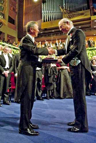 頒獎(jiǎng)當(dāng)天共有8人上臺(tái)領(lǐng)獎(jiǎng),高錕被安排在第一個(gè)。瑞典國(guó)王卡爾十六世—古斯塔夫破格走向高錕站立處為他頒獎(jiǎng),彼此親切握手致意。高錕從容自若,滿(mǎn)臉笑容從瑞典國(guó)王手中接過(guò)諾貝爾物理獎(jiǎng)狀,場(chǎng)面相當(dāng)溫馨。