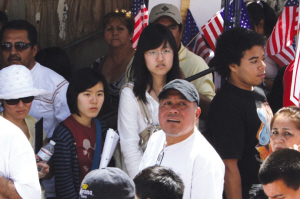 記者站在游行指揮前導(dǎo)車上望眼欲穿地在人海中搜索著華人的蹤影,總算在5街路口的人行道上看到了兩個(gè)埋沒在人海中的華裔女孩。但據(jù)兩人的自我介紹,她們是南加大的學(xué)生,是出來進(jìn)行測(cè)繪的,和這場(chǎng)大游行毫不相干,只是趕上了,就站在路邊看個(gè)熱鬧而已。(高睿)