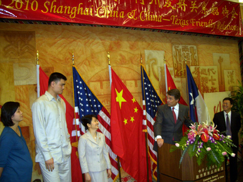 作為特別的嘉賓,姚明也發(fā)表了感言。他出生在上海,對(duì)上海有著特殊的感情。在德州休斯頓打球幾年來,他覺得也有必要向家鄉(xiāng)和祖國人民介紹德州“牛仔們”的生活和經(jīng)濟(jì)文化科技發(fā)展?fàn)顩r。他非常高興佩里州長能親自率團(tuán)參加上海世博會(huì)。