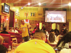在華裔聚居區的清吧、飯店及西餐廳里,到處都聚集了湖人的球迷,他們說,買不起決賽的門票,聚在酒吧里,也可以增加一些看球的氣氛。他們一邊吃著烤雞、炸薯條,還可以喝一點啤酒,并高聲為自己喜歡的科比高喊“MVP”,“MVP”,很是來勁。