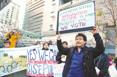 由亞裔、拉丁裔、非裔等不同族裔移民團體組成的“舊金山移民法律及教育聯(lián)絡網”,19日傍晚在舊金山聯(lián)邦政府大樓外示威集會。華人權益促進會移民政策統(tǒng)籌楊敏思指出,奧巴馬當選上任剛滿一年,即將于下周發(fā)表國情咨文,移民團體希望趕在國情咨文發(fā)表前,向奧巴馬政府要求立即推出移民改革法案。