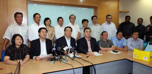 廖派宣布取消1128特大,并以交流會取而代之。前排左起為周美芬、王乃志、廖中萊、魏家祥、黃日升、廖潤強與何國忠。(圖:星洲日報)