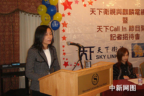 圖為麒麟電視總裁Nancy Li在當日的記者會上介紹麒麟電視與天下衛視的合作。