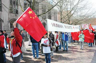 中新網(wǎng)4月16日電 綜合美國(guó)華文媒體消息,4月14日,正當(dāng)達(dá)賴?yán)镌谌A盛頓大學(xué)體育館發(fā)表演講之際,大批華人華僑在場(chǎng)外高舉五星紅旗、“反分裂、愛和平”的標(biāo)語,抗議達(dá)賴訪美。示威人士高舉標(biāo)語指控媒體報(bào)道西藏新聞不公正,并稱西藏的喇嘛幕后操控暴亂。這是3月14日拉薩發(fā)生暴亂以來,達(dá)賴?yán)锏谝淮纬鐾庠L問時(shí),遭遇到華人對(duì)他的直接抗議。