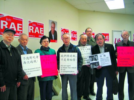 中新網10月10日電 據加拿大《明報》報道,加拿大安省華裔人頭稅苦主及家屬聯盟多名代表10月8日手持抗議標語及請愿信,前往自由黨國會候選人李博(Bob Rae)位于市中心的競選辦公室,要求他延續昔日未加入自由黨時的精神,支持爭取人頭稅的徹底平反;然而李博當日不在其辦公室,而其競選經理則以眾人“沒有預約”為由,接過請愿信后便要求眾人離場,態度冷淡。