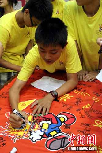 8月3日,來自美國、加拿大和烏克蘭的70位海外華裔青少年,圓滿結束“2010年海外華裔及港澳臺地區青少年‘中國尋根之旅’夏令營”天津地區參訪活動。圖為營員們在營旗上簽名留念。 作 者:郭曉帆