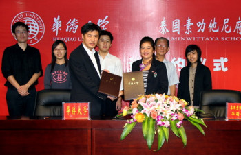 中新網10月27日電 據華僑大學新聞網消息,10月24 日上午,華僑大學與泰國素叻他尼府華萌學校在華大廈門校區簽署合作備忘錄。華僑大學華文教育辦公室主任趙明光、泰國素叻他尼府華萌學校副經理安蒙麗分別代表雙方在合作備忘錄上簽字。出席簽字儀式的還有泰國素叻他尼府華萌學校校董涂碧泉及華僑大學華文教育辦公室工作人員。