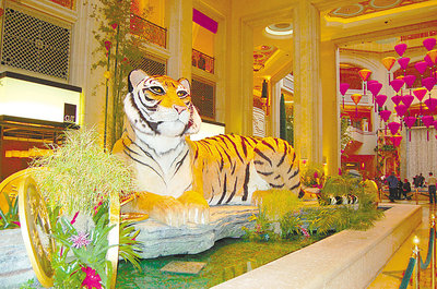 中新網2月10日電 據美國《世界日報》報道,今年中國新年巧逢西洋情人節,然而拉斯維加斯賭城大道上賭場仍以歡慶中國新年為主,主題布置紛紛選用中國春節特色,春聯、老虎、紅燈籠、橘子,祝福游客新年如意。
