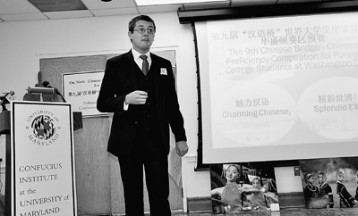這不是廣播或電視臺的情感節(jié)目,而是近日在馬里蘭大學孔子學院舉辦的第九屆大學生“漢語橋”比賽中的精彩一幕。來自喬治·梅森大學的塞妮亞一開口,就引起了觀眾的好奇,大家本以為這位長相甜美的美國姑娘忍不住要曬一曬她的浪漫故事。沒想到,她的這個“他”原來是漢語。在她眼里,漢語優(yōu)雅美麗,深深打動了她,并從此和漢語形影不離。
