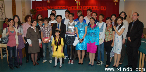 第三屆“漢語橋”匈牙利賽區(qū)的第一名由匈中雙語學(xué)校的心情獲得,王慶年為她頒發(fā)了獎狀和獎品;第二名由羅蘭大學(xué)孔子學(xué)院的丹尼爾、周德偉,東方語言學(xué)校的李麗獲得,艾爾戴伊校長為他們頒發(fā)了獎狀;其余的同學(xué)獲得了三等獎,賽后全體成員合影留念。