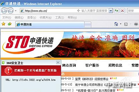 中新網5月21日電 5月19日,360安全中心監測到國內知名物流公司申通快遞的官方網站首頁被黑客“掛馬”。大量經常登陸申通官網進行快件查詢的用戶,如果電腦中存在軟件漏洞,就會被植入惡意代碼,面臨淪為“肉雞”的威脅。截至5月20日上午,申通官網首頁此次的“掛馬”已經被清除。