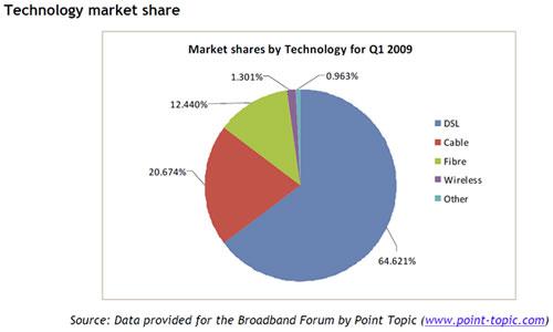 按技術劃分,DSL仍是主流寬帶技術,市場份額為64%。其次為線纜(有線電視)接入,市場份額為20%。光纖排名第三,市場份額為12%。