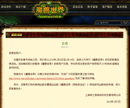 網易昨天是在一篇魔獸世界游戲內活動的公告中披露上述消息的。公告稱將從2010年2月8日至2月14日,連續七天舉行《魔獸世界》老玩家新春回饋活動;顒悠陂g將暫停《魔獸世界》的新用戶注冊,并向所有注冊老用戶按照每天3小時的標準贈送游戲時間。