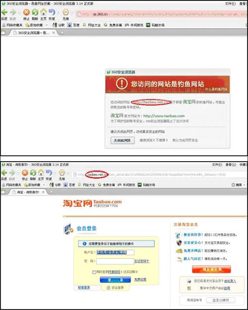 360安全瀏覽器攔截模仿知名網站的釣魚網頁
