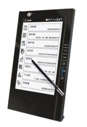 通體白色的機器,屏幕上古雅的國畫畫面,108種內置正版書,著實吸引了不少人的圍觀,而這款機器正是由中國出版集團公司推出的電子閱讀器,“這款電子閱讀器的推出標志著中國出版集團正式進入電子閱讀器產業,也是中國出版集團從傳統出版集團向新型出版集團邁進的重要一步”。中國出版集團總裁聶振寧說。據現場工作人員介紹,這款電子閱讀器包括了中國出版集團的所有圖書并都擁有電子版權,可供讀者下載閱讀。而仗著內容的優勢,其閱讀器的市場銷售價在5000元左右,比市場上流行的閱讀器兩三千元的價格高出一大截。