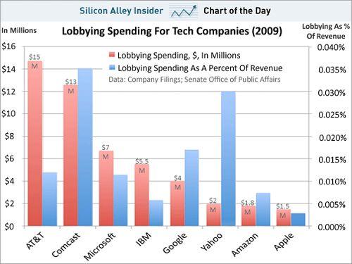 有趣的是,圖表顯示蘋果公司在游說(shuō)方面的花費(fèi)最少,可能與它沒(méi)有市場(chǎng)壟斷有關(guān)。