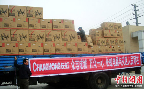 4月19日,在駐地部隊(duì)某部的組織下,長(zhǎng)虹緊急從蘭州、西安等庫(kù)房抽調(diào)貨源,發(fā)出1000臺(tái)電視;20日,長(zhǎng)虹再次發(fā)出610臺(tái)電視。