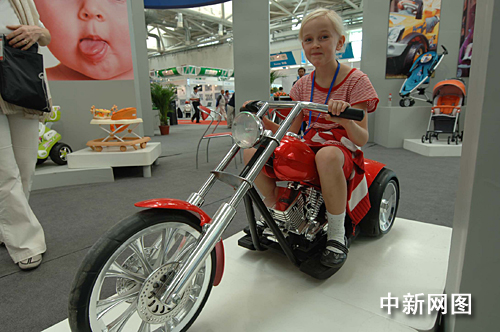 展覽會上,一個外國孩子騎著中國發明制造的玩具電動車。(鄒憲 攝)