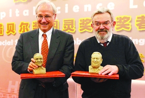 昨日,諾獎得主馬丁努恩·韋爾特曼(右)和圖靈獎獲得者巴特勒·萊普森(左)接受首都科學(xué)講堂送給他們的頭像雕塑。本報(bào)記者 浦峰 張濤 攝