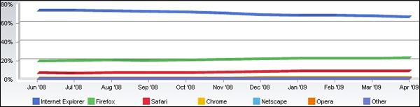 過(guò)去12個(gè)月,IE市場(chǎng)份額平均每月下降0.7%。如果按照該趨勢(shì)發(fā)展,2011年5月,IE有望跌破50%。