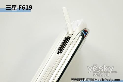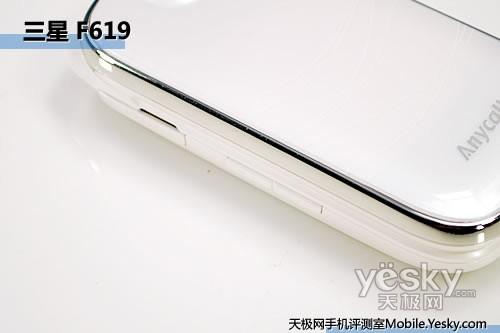三星F619機身左側設計了I/O與音量控制鍵,三合一I/O接口采用了三星自主標準接口,同時需要撥接耳機與數據線,降低了融通性。機身右側僅設計了microSD卡槽,卡槽之上加蓋了防塵蓋,有效的保護了內存卡不受塵土影響。