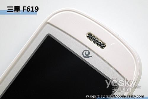 翻開三星F619的翻蓋,該機并沒有對手機內側進行太多的修飾,一樣是白色的主旋律,2.4英寸TFT屏幕位于上翻蓋,聽筒上加蓋了金屬防塵網,雖然聽筒孔徑有限,但通話聲音洪亮。一顆天翼的Logo標志著三星F619的定制地位。