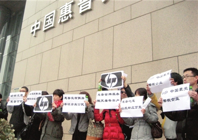 當天上午10點半左右,在國貿橋東南角的中國惠普大廈門前,十余名消費者手舉自制的紙牌抗議,引來路人圍觀。紙牌上寫著“蟑螂無罪惠普可恥”、“HP,中國最受鄙視企業”、“惠普之道,以狡辯應萬變”等口號。抗議進行了10分鐘左右,消費者來到中國惠普大廈的8層,看到“惠普解決方案體驗中心”的招牌后,消費者又舉起紙牌進行抗議,并要求與售后總監談判。11點左右,惠普售后總監陳女士來到現場。