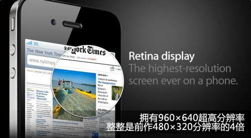 毫無疑問,iPhone4硬件層面的最大亮點(diǎn)之一,則是其號稱“Retina Display”的顯示屏幕,其官方稱,該屏幕擁有960×640超高分辨率,是480×320分辨率的4倍,也就是說,iPhone4一屏可顯示的內(nèi)容量是iPhone3的四倍。即使是目前一些高端Android平臺(tái)的手機(jī),最高分辨率也只有854×480,與其仍有不小的差距。