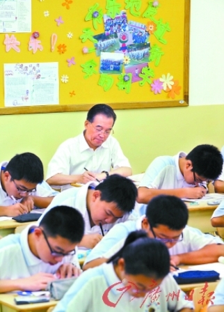 9月4日上午,在第25個教師節到來前夕,溫總理坐在北京市第三十五中學的中學生中間聽講,腰板挺直,坐姿端正。學生們則多數趴在桌上,歪著身子寫字。