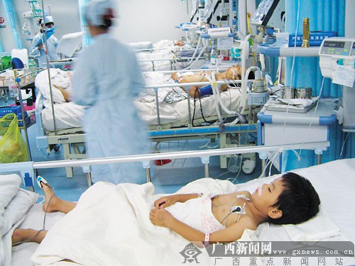 6月23日下午2時,記者趕到貴港市人民醫(yī)院時,正遇見自治區(qū)衛(wèi)生廳、教育廳的領(lǐng)導(dǎo)前來看望中毒的幼兒。在醫(yī)院外科樓二樓的重癥監(jiān)護(hù)室內(nèi),5名幼兒正在接受救治,其中3名病情較重。一名看起來只有四五歲的小孩口鼻插著導(dǎo)管,躺在床上不停地抽搐。醫(yī)生告訴記者,這名幼兒身體素質(zhì)較差,被送到醫(yī)院搶救后出現(xiàn)了血尿、高燒、肺水腫等癥狀,有病情加重的趨勢。后來,經(jīng)過搶救,病情得到緩解。