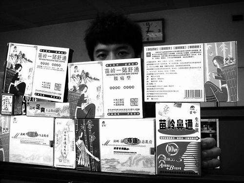 “我有鼻炎,常常鼻塞,有沒有什么好藥?”記者問!氨侨俊睜I業員從柜臺里面又取出一盒藥說,“你用苗嶺鼻通生態液吧,也是全中藥,效果特別好。”
