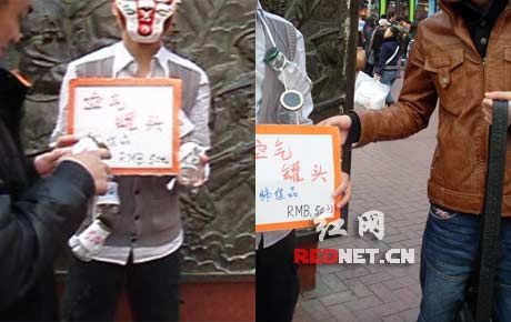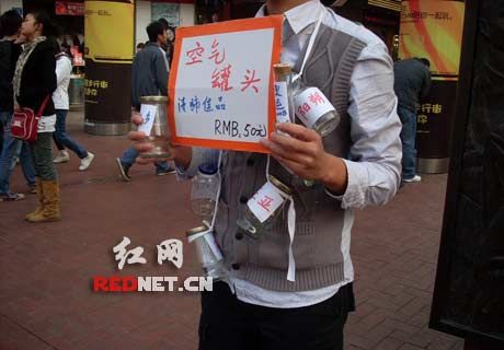 “發寶氣的吧?太扯淡了,竟然叫賣空氣!”23日傍晚,網友“閃賞”在紅網論壇發帖爆料,稱自己當天下午在長沙黃興路步行街逛街,在黃興銅像旁看到一男子臉上戴著面具,全身掛滿了寫著陽朔、三亞、可可西里、九寨溝字樣的玻璃瓶,手舉“空氣罐頭,50元”的紙牌,引來不少人圍觀。男子自稱空氣是從全國各地方收集來的,屬他勞動成果,所以他有理由出售而贏利。