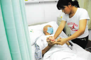 昨日(26),西南醫院,女兒正為父親擦手 記者 張路橋 實習生 胡健 攝