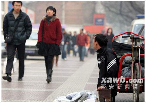 “襪子10塊錢4雙,大家來看看。”昨日(12月18日)下午3時許,在東大街上,尋常的叫賣聲中,一個小販坐在小木凳上,身著破舊的運動服,面前是一個小地攤,放著各色各樣的新襪子。他的身體倚著一輛手搖車,面帶微笑地望著過往行人。
