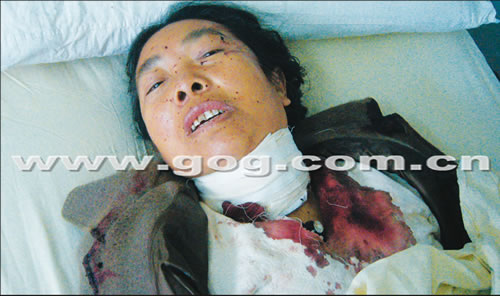 昨日下午,記者在貴醫附院看到了這名躺在病床上的老人。老人大約50多歲年紀,女性,衣著較為整潔。接診護士告訴記者,老人剛被送到醫院的時候可以說話,但是問及家里的情況時,老人卻拒不回答。同時,護士還表示從老人的只言片語中聽到,老人說咽喉部位插的水果刀是她自己捅的。