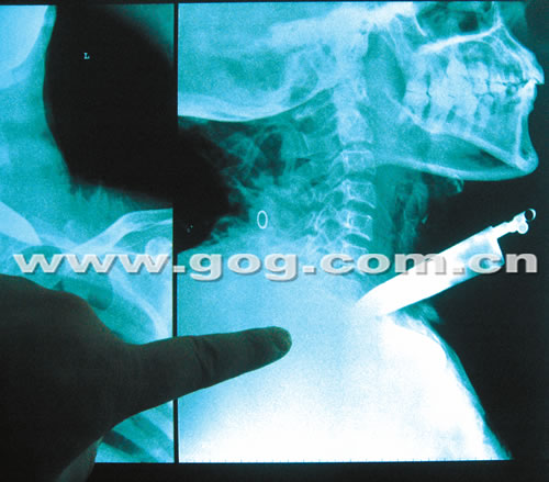 貴醫附院耳鼻喉科主治醫生王曉云告訴記者,老人被送到醫院時,喉嚨上插著一把水果刀,進入喉嚨的刀鋒部分大約有6.5公分。王曉云說:“經檢查,老人頸部和肺尖受傷,生命垂危。由于水果刀可能傷到大動脈,手術有風險,要求家屬簽字,但老人一直不透露家人的信息,我們醫院也很為難。”