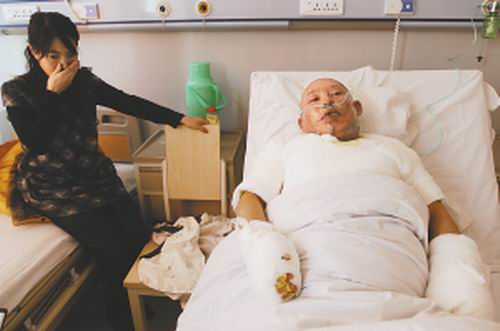 昨日,記者在吉林省武警醫(yī)院見(jiàn)到了來(lái)自公主嶺市陶家屯鎮(zhèn)久勝村6社41歲的劉國(guó)軍。他的頭部、面部都抹滿了藥膏,上半身及雙手都裹著厚厚的紗布,好在還神志清醒。