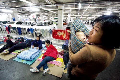 圖為由于車輛進(jìn)出頻繁,地下車庫(kù)內(nèi)噪音較大,不少孩子哭鬧難眠,一名婦女正在車庫(kù)內(nèi)來(lái)回踱步,哄懷中的孩子睡覺(jué)。 攝/記者王丹