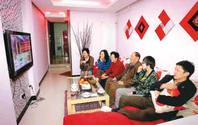 劉樂(左二)和家人在裝飾一新的客廳里看電視。人民日報記者 李石營攝