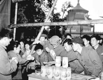 一九七九年四月,顧客在北京市首次舉辦的天壇商品交易會上爭購搪瓷保溫杯。徐建中攝