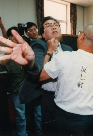 待劉闊才又握住一支麥克風,準備作裁定時,朱高正在高喊“我要求辯論”后雙手一撐,翻上主席臺,以雙手扭扯主席劉闊才,劉闊才在座位上搖搖晃晃,險象環生。