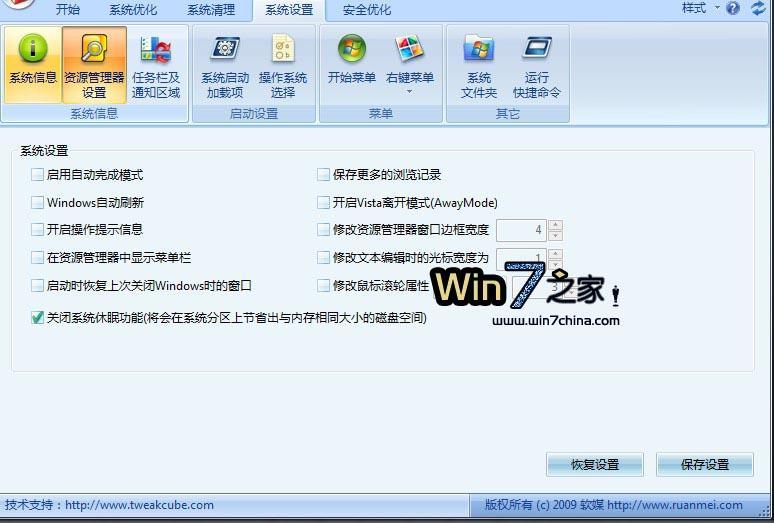 此外,從Vista時代,由于睡眠功能的存在,休眠功能其實(shí)已經(jīng)趨向于可有可無了,同時,禁用休眠功能還可以節(jié)省出于內(nèi)存同等大小的硬盤空間,因此,我們建議大家使用Windows 7優(yōu)化大師 (點(diǎn)此下載) 或魔方 (點(diǎn)此下載)中的系統(tǒng)設(shè)置關(guān)閉休眠功能。