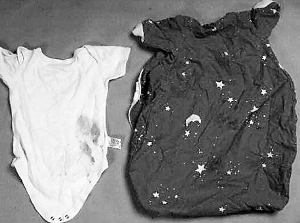 法庭展示的Baby P曾經穿過的衣服,上面沾滿血跡。