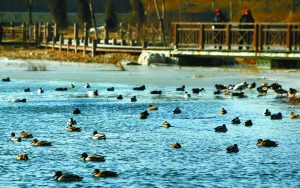 昨日,野鴨在奧林匹克森林公園水中游弋。共300多只野鴨到此過(guò)冬。本報(bào)記者 浦峰 攝