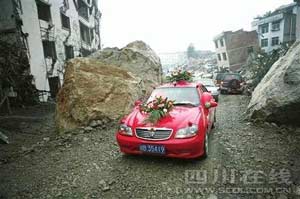 據(jù)了解,新郎叫喬貴田,新娘叫陳佳,都是北川人,喬貴田向記者說:“我們原定2008年國慶結(jié)婚的,可地震了。我和陳佳就商量:等歷史重新翻開一頁的時候,我們就結(jié)婚。因為到她家迎親必須穿過縣城,我想通過縣城迎親,絕對一輩子終身難忘。于是,就找管關(guān)卡的領(lǐng)導(dǎo)通融,領(lǐng)導(dǎo)一聽,竟破例讓我們通過……”