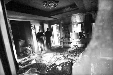 昨日上午9時(shí)30分許,記者在火災(zāi)現(xiàn)場(chǎng)看到,房屋客廳內(nèi)一片狼籍,地板、沙發(fā)、電視機(jī)等都被燒毀,窗戶被撬開(kāi),墻壁都被熏黑了,門(mén)前有一個(gè)使用過(guò)的滅火器。 民警、消防人員正在勘查現(xiàn)場(chǎng)。